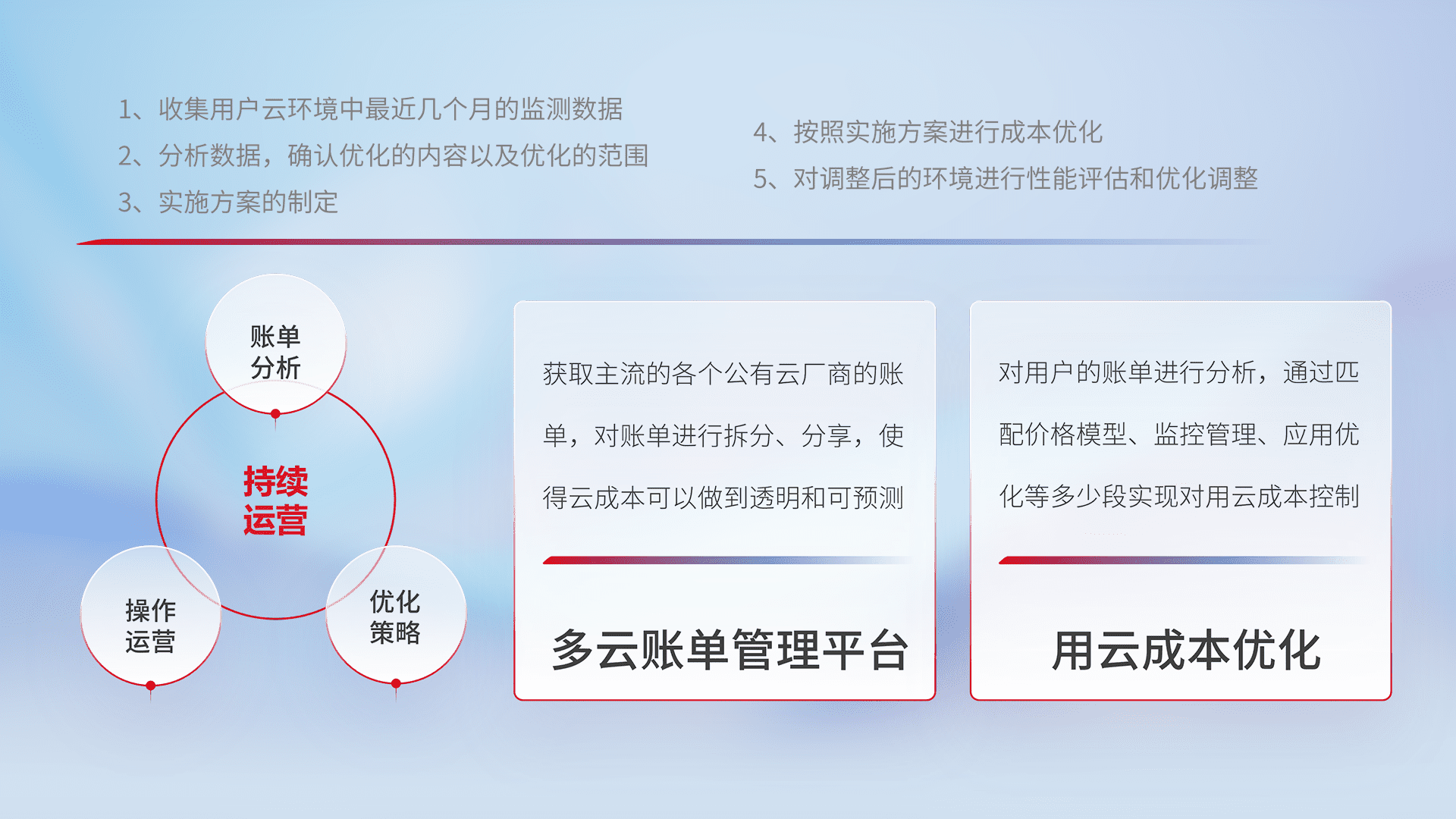通过多云纳管,,以统一的资源数据模型把客户的云资源进行抽象和封装,,,,进而实现对多云资源的统一操作,,保障云资源管理的可靠性、、、、稳定性与可用性。。量身定制化运维内容,,配置、、开发运维、、、补丁管理、、备份、、监控、、、认证和访问管理、、、审计和日常巡检等,,保障在用云过程中的可靠度,,,,稳定度以及高可用率。。